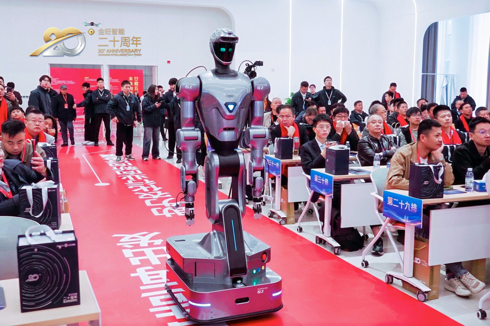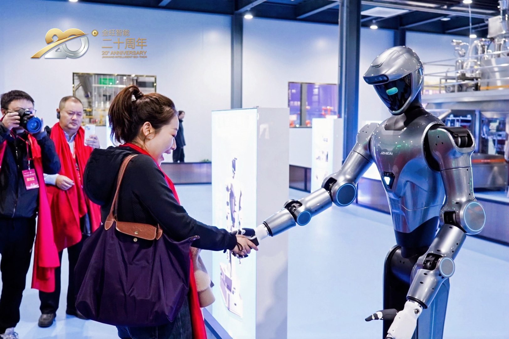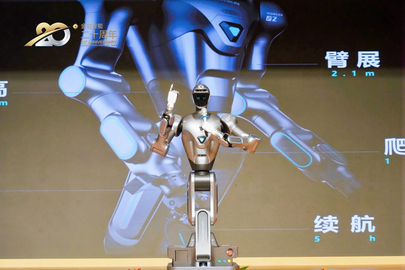 慶典現(xiàn)場,農(nóng)化制劑行業(yè)首款人形機(jī)器人"金智勞動(dòng)者"(小名"小旺")的全球首發(fā)將活動(dòng)推向高潮。這款具備27個(gè)主動(dòng)自由度關(guān)節(jié)的機(jī)器人,以其靈巧的多功能夾爪和精準(zhǔn)的操作能力,完美展示了在農(nóng)化制劑工廠中的多樣化作業(yè)潛力。