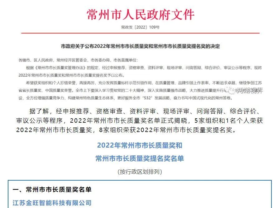 金旺智能始終堅持“智能、穩(wěn)定、高效、綠色”的理念,在質(zhì)量管理、持續(xù)創(chuàng)新、承擔社會責任、文化建設等方面取得了顯著成效。經(jīng)層層審核,金旺智能榮獲常州市最高質(zhì)量獎項——2022年常州市市長質(zhì)量獎。