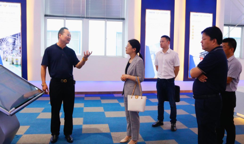 李冬英一行領(lǐng)導(dǎo)對(duì)金旺智能樣板車間、文化展廳進(jìn)行實(shí)地參觀,董事長(zhǎng)房國(guó)榮對(duì)企業(yè)核心技術(shù)、技術(shù)團(tuán)隊(duì)、科技成果以及轉(zhuǎn)化應(yīng)用情況做了一一介紹。