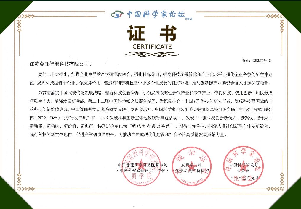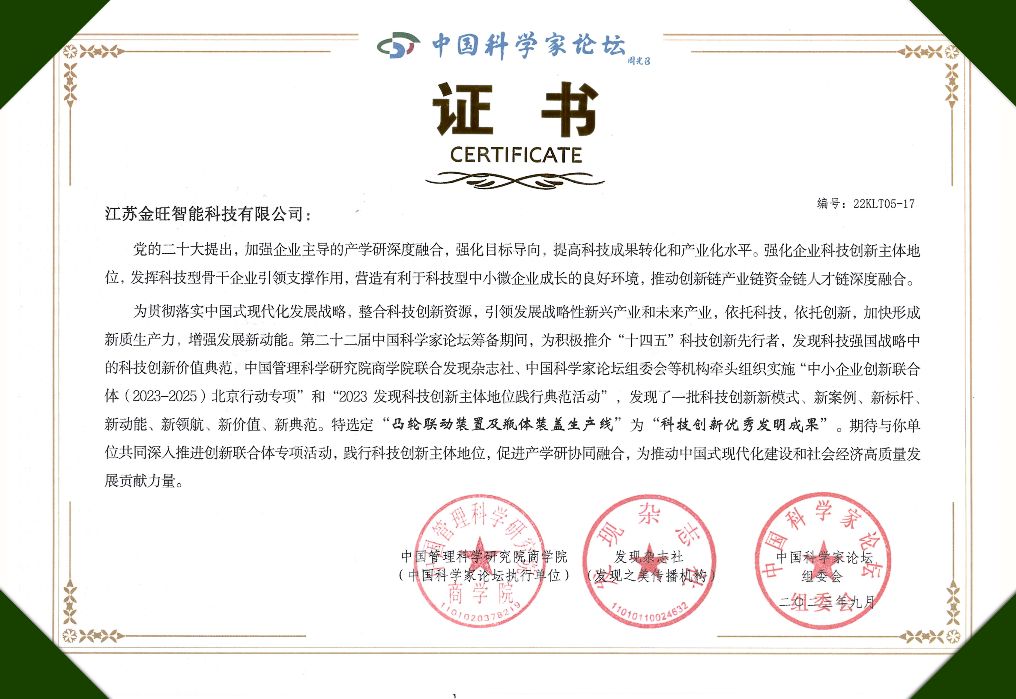 江蘇金旺智能科技有限公司被授予“科技創(chuàng)新突出單位”,“凸輪聯(lián)動(dòng)裝置及瓶體裝蓋生產(chǎn)線”評(píng)定為“科技創(chuàng)新優(yōu)秀發(fā)明成果”,董事長(zhǎng)房國(guó)榮被聘為“中國(guó)科學(xué)家論壇常務(wù)理事”!