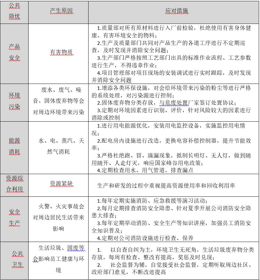 公司通過積極主動(dòng)地走訪顧客、社區(qū)和政府主管部門,以及學(xué)習(xí)法律法規(guī)、現(xiàn)場(chǎng)聽取員工意見方法確定公眾的隱憂。特別是當(dāng)引進(jìn)新工藝與新設(shè)備、重大技術(shù)改造(如新、改、擴(kuò)項(xiàng)目)可能導(dǎo)致新的影響和風(fēng)險(xiǎn)時(shí),公司按《環(huán)境影響評(píng)價(jià)法》《職業(yè)病防治法》《消防法》、顧客及相關(guān)方要求,系統(tǒng)地考慮公眾對(duì)產(chǎn)品、服務(wù)、運(yùn)營(yíng)的隱憂,并對(duì)此主動(dòng)并預(yù)先做出應(yīng)對(duì)準(zhǔn)備(如環(huán)保、健康安全設(shè)施的同時(shí)設(shè)計(jì)、同時(shí)施工、同時(shí)投入使用;產(chǎn)品中禁用有害化學(xué)物質(zhì)、節(jié)能環(huán)保材料的使用、廢棄物的回收再利用等)。公司針對(duì)公眾隱憂的原因分析及采取措施見下表。