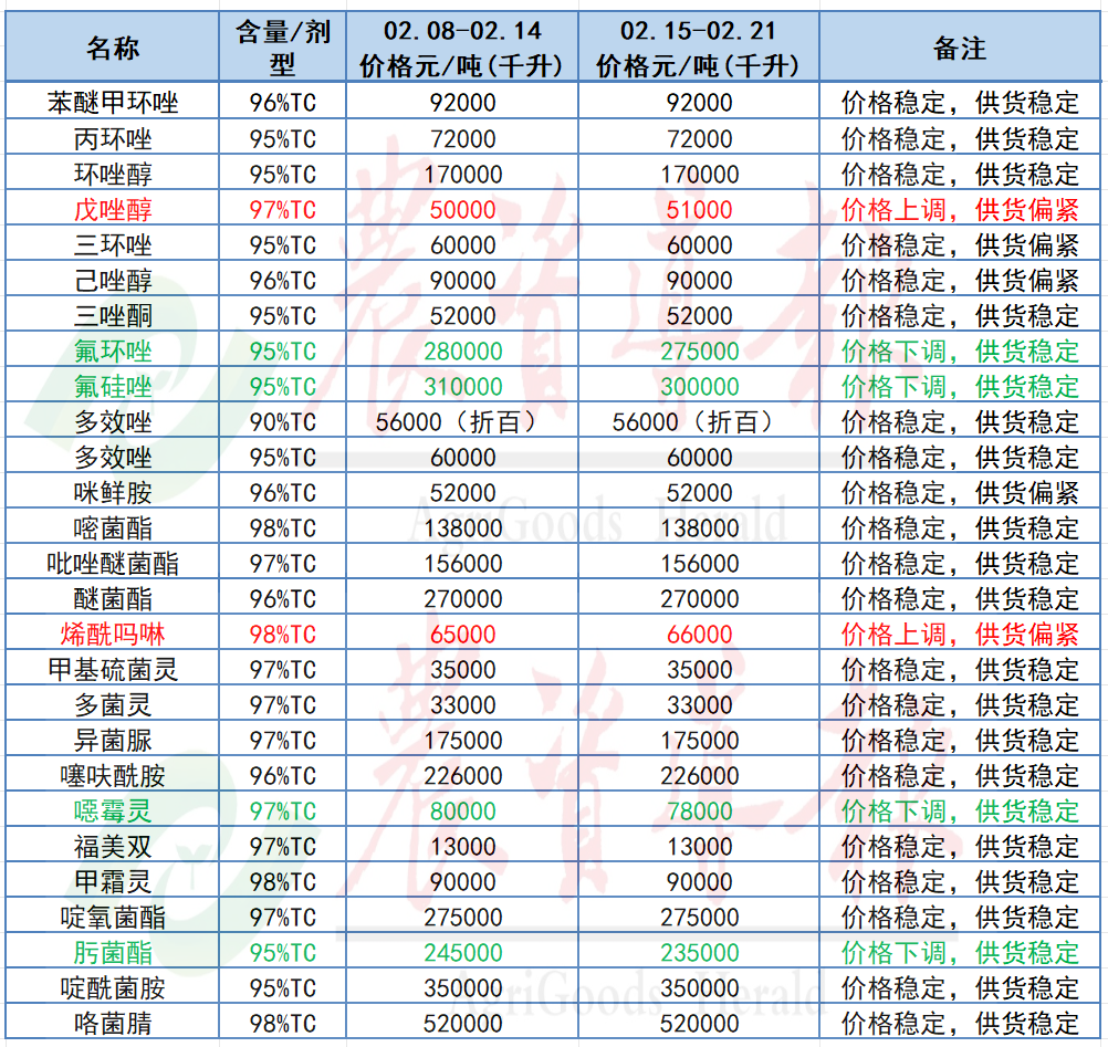 97%戊唑醇原藥價格上漲1,000元,至51,000元/噸;98%烯酰嗎啉原藥上漲1,000元,至66,000元/噸。