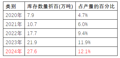 原藥企業(yè)庫存增多。近5年,農(nóng)藥原藥庫存逐年增加,2024年農(nóng)藥庫存數(shù)量達到27.6萬噸,占當(dāng)年產(chǎn)量的12.1%,農(nóng)藥的生產(chǎn)過剩問題初步顯現(xiàn)。