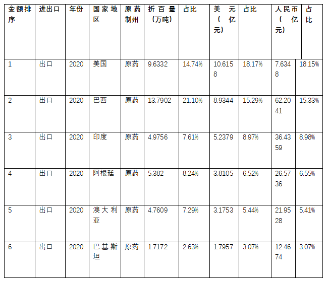 表6 2020年中國農(nóng)藥出口的國家數(shù)據(jù)分析