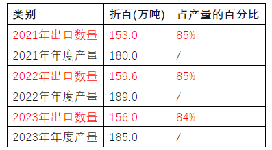 近5年,中國農(nóng)藥出口數(shù)量(折百)大幅增加,共出口786萬噸,同比增長73%;年平均為157萬噸,同比增長74%。2021、2022、2023年出口數(shù)量占當(dāng)年產(chǎn)量的85%左右。