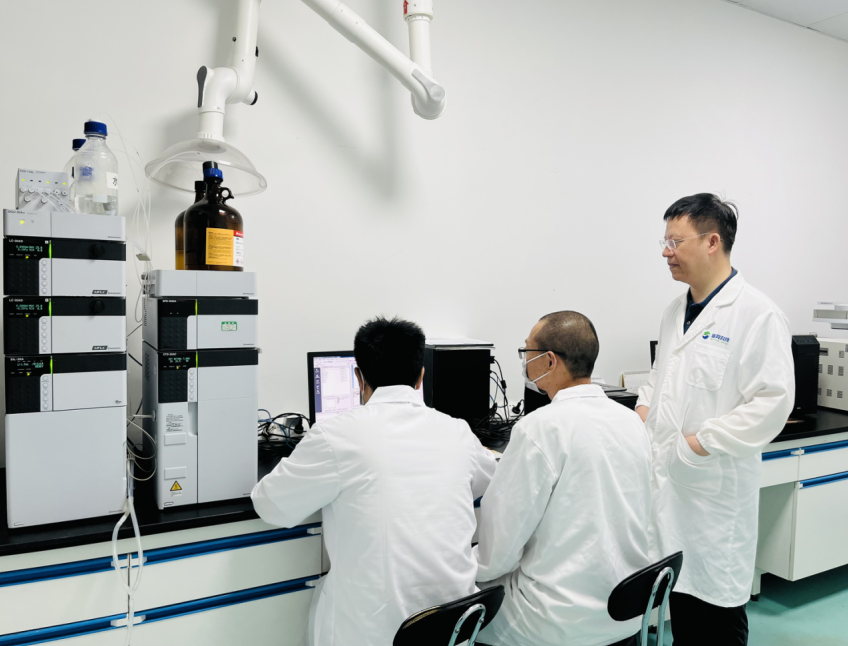 唐雪明(右一)和他的團隊成員在實驗室做RNA生物農(nóng)藥的檢測分析