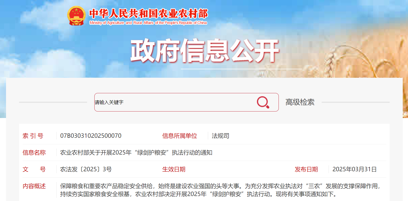 農(nóng)業(yè)農(nóng)村部關(guān)于開展2025年“綠劍護(hù)糧安”執(zhí)法行動(dòng)的通知