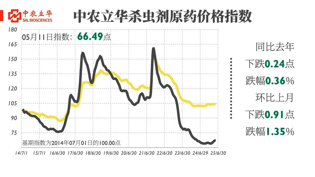 2025年5月11日,中農(nóng)立華殺蟲劑原藥價(jià)格指數(shù)報(bào)66.49點(diǎn),同比去年下跌0.36%,環(huán)比上月下跌1.35%。
