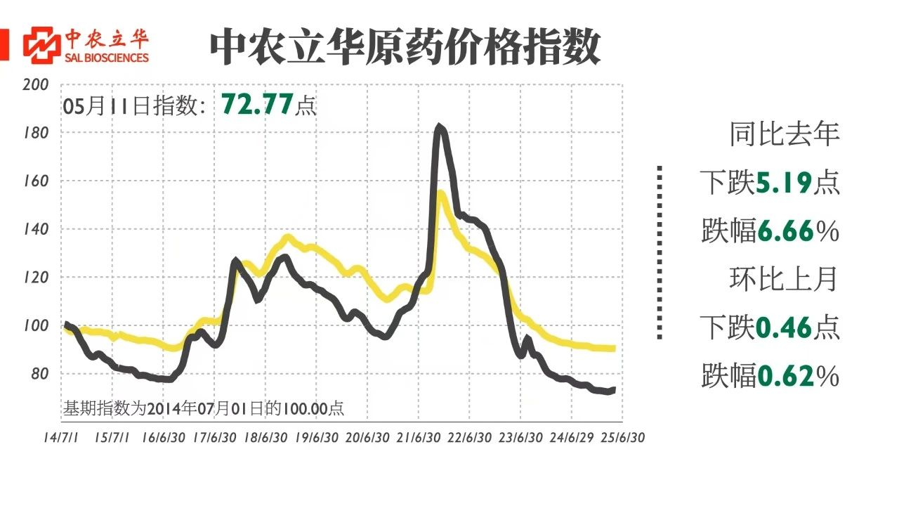 2025年5月11日,中農(nóng)立華原藥價(jià)格指數(shù)報(bào)72.77點(diǎn),同比去年下跌6.66%,環(huán)比上月下跌0.62%。跟蹤的上百個(gè)產(chǎn)品中,同比去年52%產(chǎn)品下跌;環(huán)比上月76%產(chǎn)品持平,5%產(chǎn)品上漲。