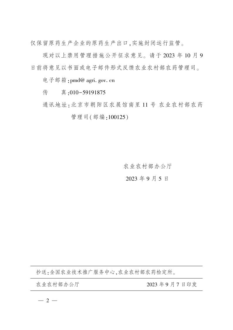 現(xiàn)對以上禁用管理措施公開征求意見。請于2023年10月9日前將意見以書面或電子郵件形式反饋農(nóng)業(yè)農(nóng)村部農(nóng)藥管理司。