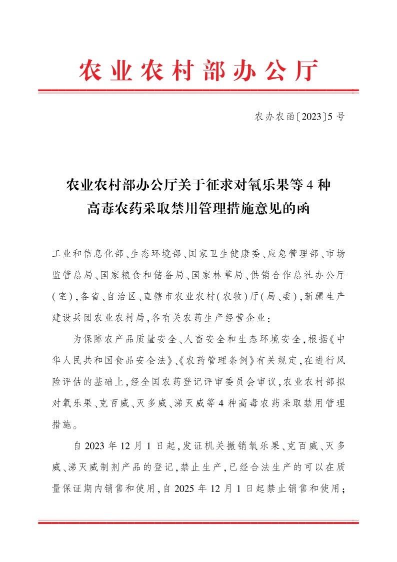 為保障農(nóng)產(chǎn)品質(zhì)量安全、人畜安全和生態(tài)環(huán)境安全,根據(jù)《中華人民共和國食品安全法》《農(nóng)藥管理條例》有關(guān)規(guī)定,在進行風(fēng)險評估的基礎(chǔ)上,經(jīng)全國農(nóng)藥登記評審委員會審議,農(nóng)業(yè)農(nóng)村部擬對氧樂果、克百威、滅多威、涕滅威等4種高毒農(nóng)藥采取禁用管理措施。