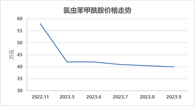 氯蟲苯甲酰胺作為雄踞全球市場銷售額位居榜首的殺蟲劑,原藥的價格在2023年之前一直保持在較高的水平,價格在240萬~300萬元/噸之間。然而,隨著產(chǎn)能的不斷釋放,中間體2,3-二氯吡啶等的價格不斷下滑,氯蟲苯甲酰胺原藥價格也急速下降,根據(jù)中農(nóng)立華提供的數(shù)據(jù)顯示,氯蟲苯甲酰胺原藥價格目前已降至40.0萬元/噸。