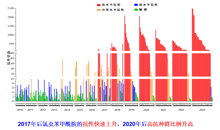 隨著氯蟲苯甲酰胺使用年限及用量的增加,一些害蟲對其的抗性呈現(xiàn)上升趨勢。例如,水稻上的二化螟、稻縱卷葉螟等害蟲的抗性就呈現(xiàn)快速上升趨勢。另外,甜菜夜蛾、小菜蛾等害蟲的抗性也逐年攀升。目前一些地區(qū)的二化螟種群對氯蟲苯甲酰胺處于高水平抗性,如浙江東部沿海地區(qū)、江西環(huán)鄱陽湖地區(qū)、湖南中南部地區(qū)的二化螟種群對氯蟲苯甲酰胺的抗性倍數(shù)高達152~1,293倍。