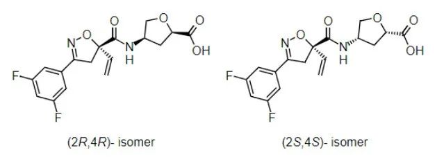Icafolin的IUPAC名稱:(2RS,4RS)-4-({[(5S)-3-(3,5-二氟苯基)-5-乙烯基-4,5-二氫異噁唑-5-基]羰基}氨基)四氫呋喃-2-甲酸,含有40%~70%的(2R,4R)-異構(gòu)體和60%~30%的(2S,4S)-異構(gòu)體;CAS登錄號:2254752-27-5;分子式:C17H16F2N2O5。