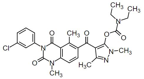吡唑喹草酯的IUPAC名稱:4-{[3-(3-氯苯基)-1,5-二甲基-2,4-二氧代-1,2,3,4-四氫喹唑啉-6-基]羰基}-1,3-二甲基-1H-吡唑-5-基二乙基氨基甲酸酯;CAS登錄號:2378093-62-8;分子式:C27H28ClN5O5。