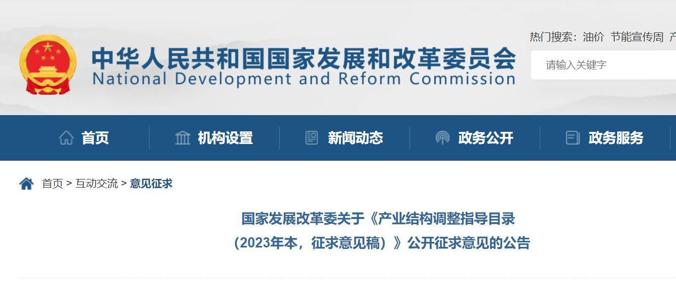 為深入貫徹黨的二十大精神,適應產(chǎn)業(yè)發(fā)展新形勢新任務新要求,加快建設現(xiàn)代化產(chǎn)業(yè)體系,國家發(fā)展改革委會同有關部門修訂形成了《產(chǎn)業(yè)結構調整指導目錄(2023年本,征求意見稿)》,現(xiàn)向社會公開征求意見。征求意見的時間為2023年7月14日至2023年8月14日。