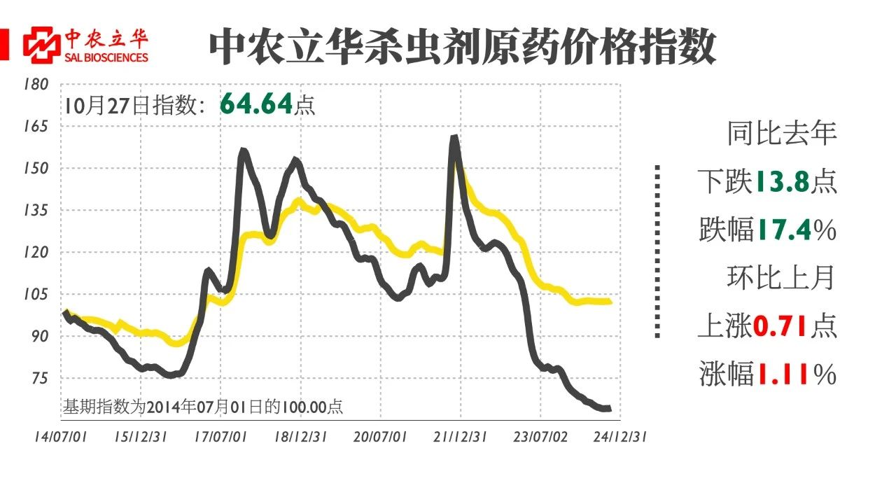 2024年10月27日,中農(nóng)立華殺蟲劑原藥價(jià)格指數(shù)報(bào)64.64點(diǎn),同比去年下跌17.4%,環(huán)比上月上漲1.11%。殺蟲劑市場詢盤活躍度增加,部分產(chǎn)品供貨緊張,如阿維菌素,甲氨基阿維菌素苯甲酸鹽原藥供需失衡,期貨排單較多;其他品種交投活躍度上升,剛需疊加冬儲(chǔ)備貨,市場信心修復(fù)中。