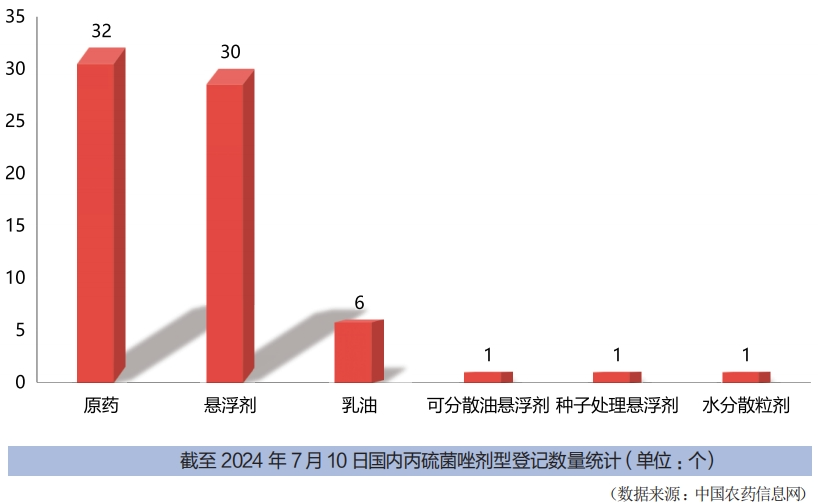 中國(guó)農(nóng)藥信息網(wǎng)顯示,截至2024年7月10日,丙硫菌唑在國(guó)內(nèi)登記產(chǎn)品達(dá)到69個(gè),其中,單劑7個(gè),原藥達(dá)到32個(gè),混劑30個(gè)。制劑劑型主要有懸浮劑、可分散油懸浮劑、種子處理懸浮劑和專(zhuān)供出口的乳油制劑。目前,這些產(chǎn)品主要登記在小麥和花生兩種作物上,用于小麥赤霉病、白粉病和銹病以及花生白絹病的防治。