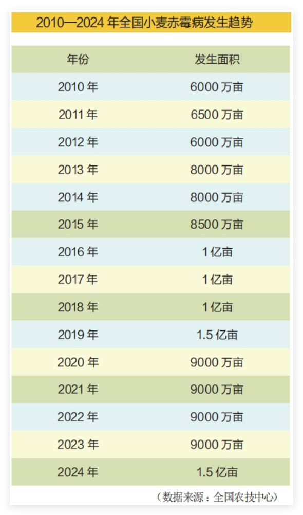 全國(guó)農(nóng)技中心數(shù)據(jù)顯示,2024年全國(guó)小麥赤霉病總體依舊偏重流行,發(fā)生面積達(dá)到1.5億畝,需預(yù)防控制面積2.5億畝次以上。