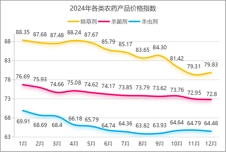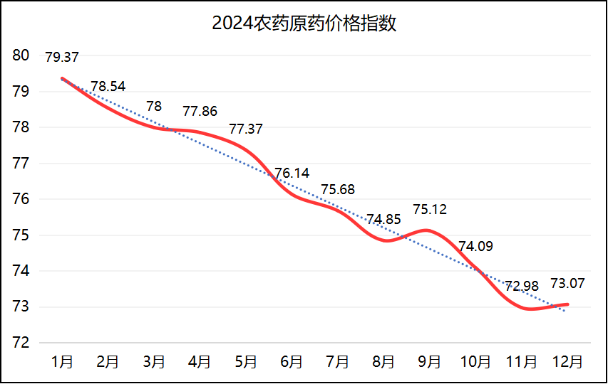 四季度,雖然已至下游“冬儲(chǔ)”時(shí)間節(jié)點(diǎn),但受多重因素影響,下游備貨積極性不高,國內(nèi)農(nóng)藥市場進(jìn)入“休整期”,需求相對(duì)低迷,外貿(mào)需求也偏弱。截至2024年12月底,原藥價(jià)格指數(shù)報(bào)73.07點(diǎn),同比下跌9.78%,65%的產(chǎn)品價(jià)格下跌。全年來看,農(nóng)藥市場受季節(jié)變化、環(huán)保政策、國際形勢等多重因素影響,價(jià)格波動(dòng)大,供需關(guān)系緊張,市場交投活躍度與價(jià)格走勢隨季節(jié)及需求變化而波動(dòng)。