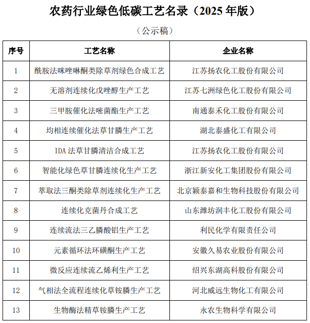 為響應(yīng)國家關(guān)于實(shí)現(xiàn)碳達(dá)峰和碳中和目標(biāo),貫徹落實(shí)《“十四·五”全國農(nóng)藥產(chǎn)業(yè)發(fā)展規(guī)劃》,推進(jìn)實(shí)施《農(nóng)藥行業(yè)綠色提升行動計(jì)劃》,促進(jìn)農(nóng)藥行業(yè)的綠色化、低碳化發(fā)展,中國農(nóng)藥工業(yè)協(xié)會將自2021年起授予的中國農(nóng)藥工業(yè)協(xié)會科學(xué)技術(shù)獎(jiǎng)中,篩選符合綠色低碳要求的生產(chǎn)工藝,以期為行業(yè)的高質(zhì)量發(fā)展提供示范引領(lǐng)。經(jīng)研究,擬將“酰胺法咪唑啉酮類除草劑綠色合成工藝”“無溶劑連續(xù)化戊唑醇生產(chǎn)工藝”“三甲胺催化法嘧菌酯生產(chǎn)工藝”“均相連續(xù)催化法草甘膦生產(chǎn)工藝”“IDA法草甘膦清潔合成工藝”“智能化綠色草甘膦連續(xù)化生產(chǎn)工藝”“萃取法三酮類除草劑連續(xù)化生產(chǎn)工藝”“連續(xù)化克菌丹合成工藝”“連續(xù)流法三乙膦酸鋁生產(chǎn)工藝”“元素循環(huán)法環(huán)磺酮生產(chǎn)工藝”“微反應(yīng)連續(xù)流乙烯利生產(chǎn)工藝”“氣相法全流程連續(xù)化草銨膦生產(chǎn)工藝”“生物酶法精草銨膦生產(chǎn)工藝”等13項(xiàng)工藝列入《農(nóng)藥行業(yè)綠色低碳工藝名錄(2025年版)》?,F(xiàn)予以公示,公示期為2025年1月20日至1月26日。
