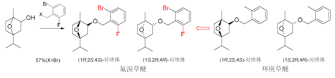 氟溴草醚是青島清原化合物公司創(chuàng)制的又一新型除草劑,可視為對(duì)環(huán)庚草醚(cinmethylin)的苯環(huán)進(jìn)行取代修飾得到。該除草劑的作用機(jī)制類同環(huán)庚草醚,為脂肪酸硫酯酶(FAT)抑制劑。室內(nèi)生測(cè)結(jié)果表明,氟溴草醚按30、60 g/hm2苗前處理對(duì)黑麥草、看麥娘、菵草和狗尾草等禾本科雜草的生長(zhǎng)抑制率≥90%(28 d),同時(shí)對(duì)花生、大豆、玉米和棉花等作物安全;按7.5 g/hm2苗后處理可完全殺死抗吡嘧磺隆的稻稗和稗草(14 d),在劑量30 g/hm2時(shí)對(duì)水稻安全。由于與當(dāng)前主流除草劑無交互抗性,氟溴草醚單用對(duì)水稻田和小麥田間抗ALS抑制劑類除草劑的鴨舌草、丁香蓼、黑麥草、看麥娘、菵草和異型莎草等禾本科雜草和莎草具有極高活性,與其他除草劑混用對(duì)甘蔗、油菜、馬鈴薯、果樹和蔬菜田間的多種禾本科和闊葉雜草也具有顯著的協(xié)同增效作用。據(jù)報(bào)道,該除草劑可用于水稻、小麥、玉米、大豆和花生及部分闊葉蔬菜作物田間雜草封閉,在水稻移栽、旱直播和水直播田間使用對(duì)稗草、稻稗、千金子和馬唐等主要禾本科雜草及部分莎草科雜草的封閉效果突出,在水田苗后早期對(duì)低齡雜草也有一定防效。氟溴草醚是(1S,2R,4R)-對(duì)映體和(1R,2S,4S)-對(duì)映體占優(yōu)勢(shì)(兩者總含量≥50%)的除草劑,且這兩種對(duì)映體的除草活性大致相當(dāng)。氟溴草醚可能的創(chuàng)制思路和合成路線見圖14,合成可共用環(huán)庚草醚的關(guān)鍵中間體。