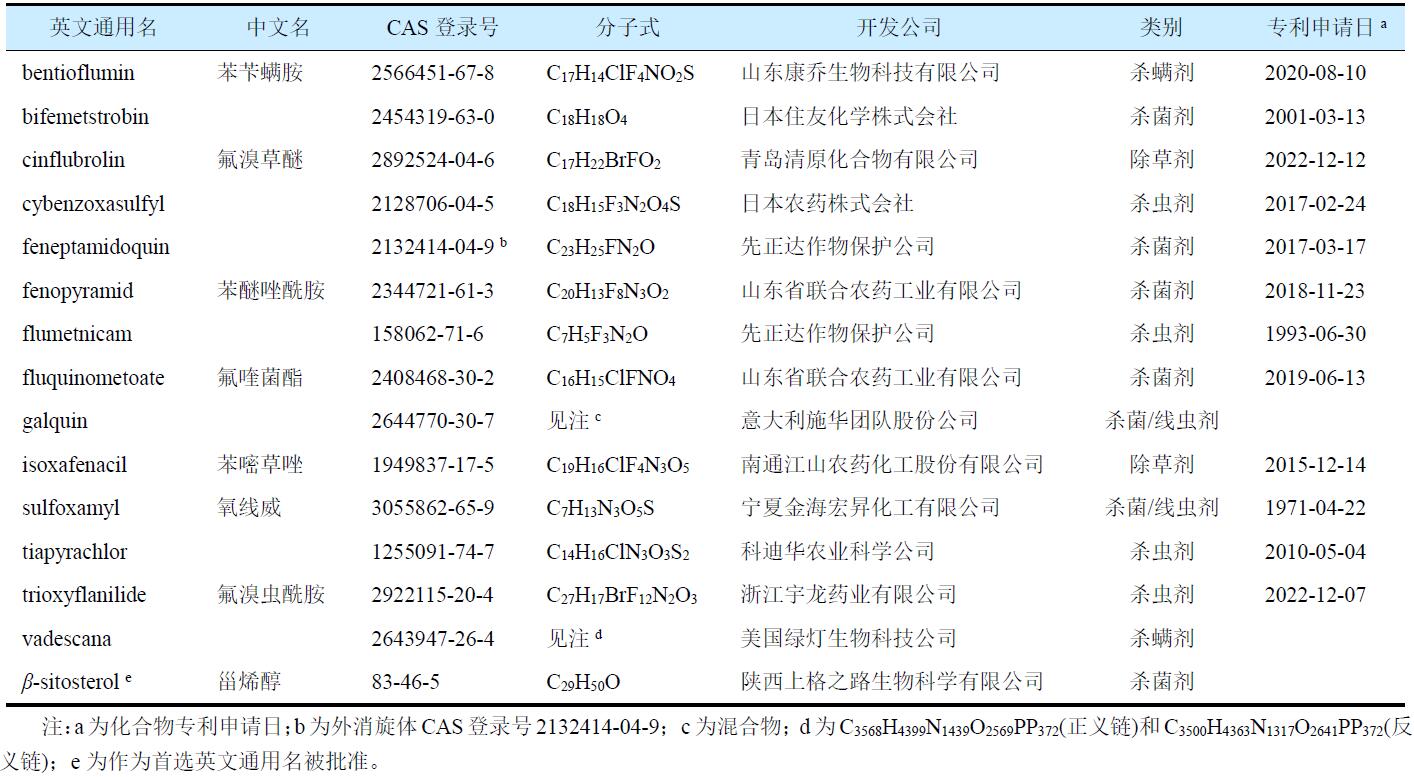 2024年ISO批準(zhǔn)并公布的來自中國(guó)、日本、美國(guó)、瑞士和意大利農(nóng)藥公司申請(qǐng)的15種農(nóng)藥新品種的英文通用名(表1),涉及殺蟲/螨劑6種、殺菌/線蟲劑7種、除草劑2種。其中,8種農(nóng)藥為中國(guó)創(chuàng)制的新品種,具體有殺蟲/殺螨劑苯芐螨胺和氟溴蟲酰胺,殺菌/線蟲劑苯醚唑酰胺、氟喹菌酯、氧線威和甾烯醇,除草劑氟溴草醚和苯嘧草唑。甾烯醇已在中國(guó)注冊(cè)登記和上市銷售,其他產(chǎn)品的產(chǎn)業(yè)化開發(fā)和登記應(yīng)用已在開展中。