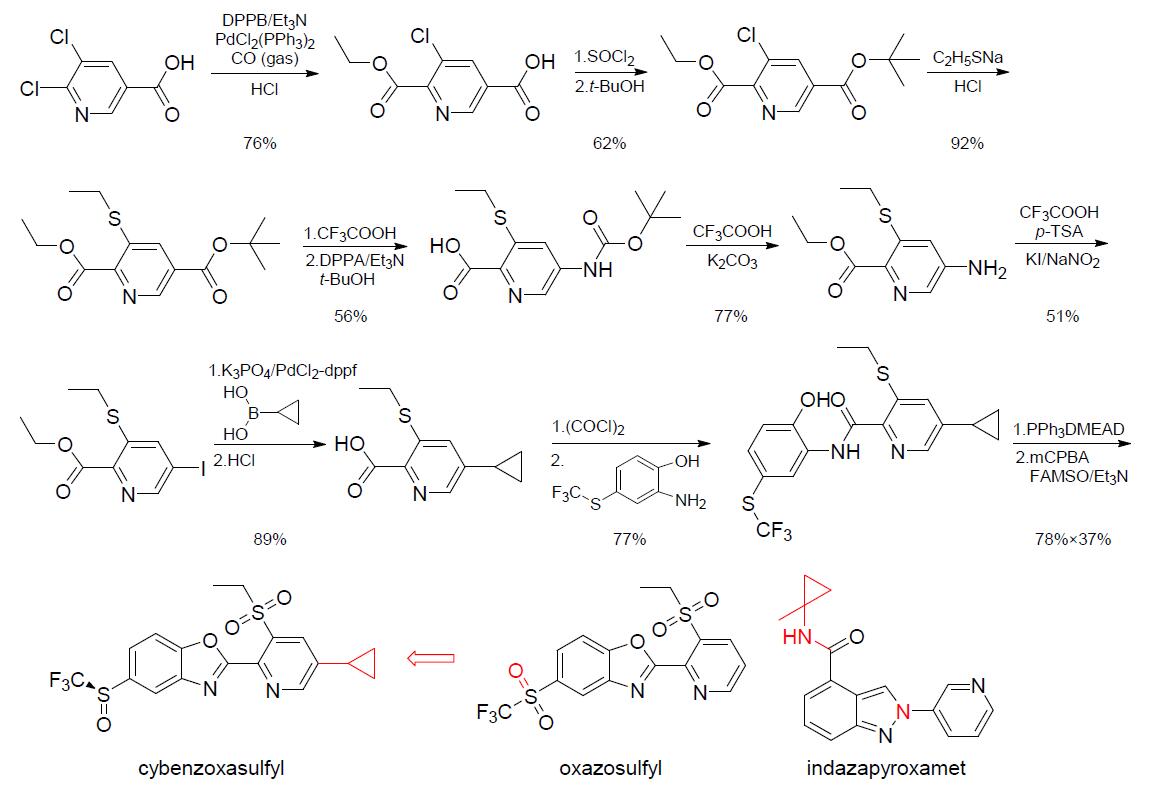 Cybenzoxasulfyl(開發(fā)代號(hào)NNI-2101)是日本農(nóng)藥株式會(huì)社研發(fā)的含乙磺?;拎ず捅讲f唑結(jié)構(gòu)的新型殺蟲劑,可視為對(duì)oxazosulfyl的吡啶基團(tuán)和三氟磺?;M(jìn)行修飾得到,在化學(xué)結(jié)構(gòu)上與indazapyroxamet也具有一定相似性。據(jù)報(bào)道分析,cybenzoxasulfyl具有內(nèi)吸和殺卵活性,對(duì)多種作物上的鱗翅目、半翅目和鞘翅目害蟲均有效且對(duì)現(xiàn)有藥劑產(chǎn)生耐藥性的害蟲防效優(yōu)異。推測(cè)cybenzoxasulfyl的作用機(jī)制類同oxazosulfyl,為狀態(tài)依賴性電壓門控鈉通道阻滯劑和囊泡乙酰膽堿轉(zhuǎn)運(yùn)蛋白(VAChT)抑制劑。室內(nèi)生測(cè)結(jié)果表明,cybenzoxasulfyl在500 mg/L劑量下,對(duì)桃蚜(6 d)、灰飛虱(8 d)和小菜蛾卵(6 d)的防效均達(dá)100%。進(jìn)一步的研究結(jié)果表明,cybenzoxasulfyl按10 mg/L噴霧處理對(duì)棉蚜和桃蚜成蟲的防效分別為69%~96.6%(6~11 d)、66.2%(4 d),與tiadinil、氟苯蟲酰胺(flubendiamide)、indanofan、螺蟲乙酯(spirotetramat)和其他多種農(nóng)藥混用對(duì)稻瘟病、小菜蛾、鴨舌草、褐飛虱和蚜蟲等防控具有協(xié)同增效作用。在公共衛(wèi)生方面的活性測(cè)試結(jié)果表明,cybenzoxasulfyl按5 mg/m2殘留暴露處理對(duì)德國(guó)小蠊若蟲(1 d)和雌性岡比亞按蚊(4 d)和白蟻的防效均達(dá)100%,按100 mg/m2殘留暴露處理對(duì)小黃家蟻(3 d)的防效也達(dá)100%。由于注冊(cè)和盈利可預(yù)期,該產(chǎn)品正在日本、韓國(guó)和印度等國(guó)開展應(yīng)用研究與注冊(cè)登記。Cybenzoxasulfyl以(R)-對(duì)映體為主,熔點(diǎn)58~60℃,其可能創(chuàng)制思路與合成路線見圖2,合成可共用oxazosulfyl的中間體。