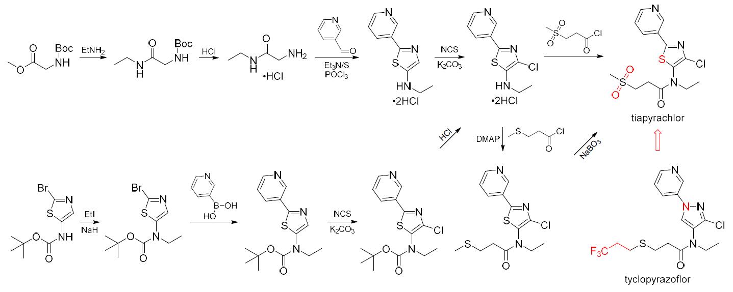 Tiapyrachlor(開發(fā)代號(hào)X12019747、XR-120和XDE-120)是科迪華公司繼tyclopyrazoflor之后開發(fā)的又一吡啶基吡唑酰胺類殺蟲劑,可視為用噻唑和甲磺酰基對(duì)后者進(jìn)行修飾得到。推測(cè)tiapyrachlor的作用機(jī)制與tyclopyrazoflor類同,主要通過干擾昆蟲的神經(jīng)傳遞系統(tǒng)而使昆蟲行為失常并最終死亡。與直接或間接作用于弦音器TRPV通道的殺蟲劑類同,tiapyrachlor對(duì)刺吸式口器害蟲具有突出的選擇活性。室內(nèi)生測(cè)結(jié)果表明,tiapyrachlor 200 mg/L對(duì)無翅桃蚜成蟲、若蟲(3 d)和煙粉虱若蟲(8~9 d)的殺死率≥80%。進(jìn)一步的研究結(jié)果表明,tiapyrachlor在低劑量時(shí)對(duì)桃蚜(0.078~1.25 mg/L)和煙粉虱(0.01~0.1 mg/L)具有一定殺蟲活性,但在400~4,000 mg/L的高劑量時(shí)卻對(duì)西花薊馬、西部牧草盲蝽(Lygus hesperus)、新熱帶棕椿象(Euschistus heros)和甜菜夜蛾的活性較低或沒有活性,與包括直接或間接作用于弦音器TRPV通道的殺蟲劑在內(nèi)的多種殺蟲劑混用都具有顯著的增效作用。Tiapyrachlor可能創(chuàng)制思路和2條合成路線見圖4,合成可共用tyclopyrazoflor的中間體。