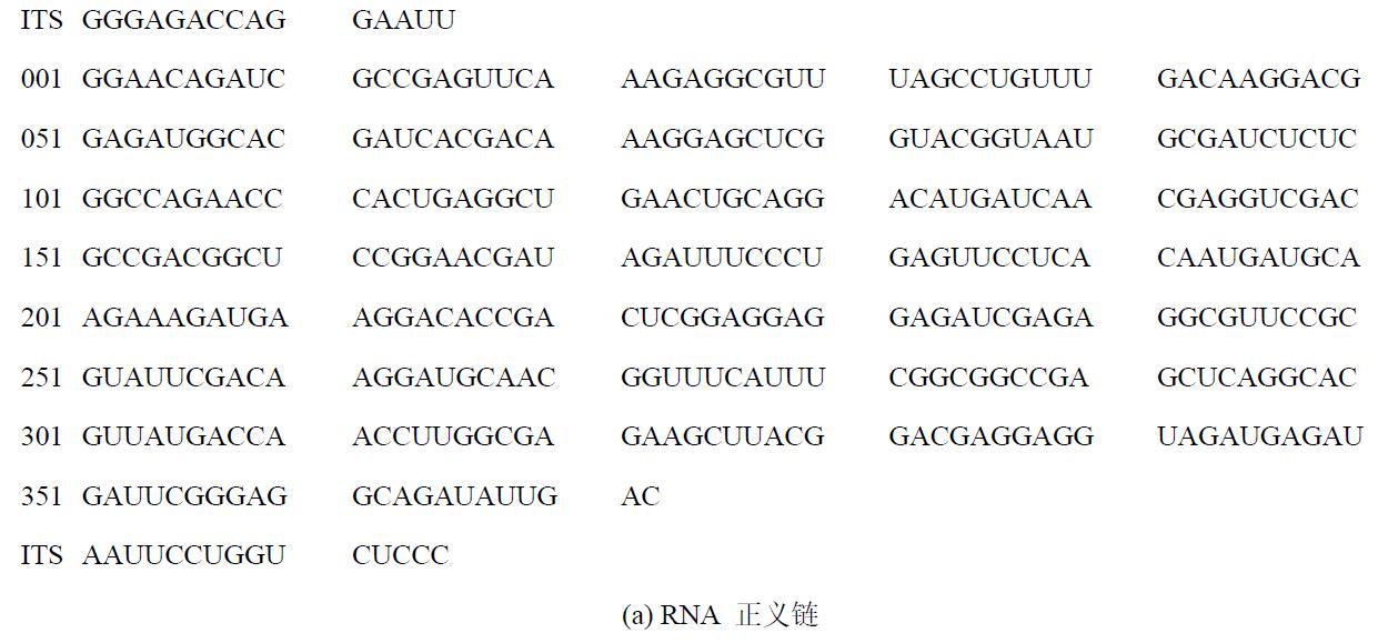 鑒于dsRNA是核苷酸序列特異性,它可以被設(shè)計(jì)成沉默瓦螨特異性的基因,從而最大限度地減少對(duì)蜜蜂和其他非靶標(biāo)物種的任何意外影響機(jī)會(huì)。野外試驗(yàn)、環(huán)境歸宿和生態(tài)毒性研究結(jié)果也證實(shí),vadescana的殘留可以忽略不計(jì),不會(huì)對(duì)蜜蜂和其他傳粉媒介產(chǎn)生不利影響。Vadescana的dsRNA分子在糖漿中快速降解,使其對(duì)蜂巢的安全性較高。同時(shí),由于在進(jìn)食后可被消化系統(tǒng)降解,血液和細(xì)胞上的屏障也會(huì)降低其生物反應(yīng)的可能性,vadescana對(duì)人類和其他脊椎動(dòng)物安全。該殺蟲劑是含有402個(gè)嘌呤和嘧啶堿基對(duì)的大分子,由腺嘌呤(A)、胞嘧啶(C)、鳥嘌呤(G)和尿嘧啶(U)構(gòu)成。其堿基序列見圖6,末端ITS共30個(gè)堿基對(duì)是制造dsRNA所需的序列,在該RNA中沒有殺螨活性。推測(cè)與其他dsRNA產(chǎn)品類同,vadescana可通過細(xì)菌表達(dá)和無細(xì)胞合成來實(shí)現(xiàn)規(guī)模化生產(chǎn)。