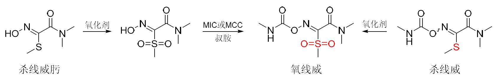 氧線威是由杜邦公司(Dupont,現(xiàn)科迪華公司)最先研究報(bào)道而由中國(guó)公司開發(fā)的新型殺線蟲劑,可視為由殺線威(oxamyl)進(jìn)一步將硫醚氧化至砜得到。推測(cè)其作用機(jī)制與殺線威一致,為乙酰膽堿酯酶(ACh E)抑制劑。氧線威對(duì)哺乳動(dòng)物低毒,在自然環(huán)境中易水解,其安全性優(yōu)于殺線威。氧線威既可預(yù)防藻菌綱類真菌引起的多種作物病害,也可用于線蟲防控。研究結(jié)果表明,南方根結(jié)線蟲2齡幼蟲的LC50為7.41~12.52 mg/L(24~72 h),90%致死濃度(LC90)為36.84~56.41 mg/L(24~72 h),對(duì)南方根結(jié)線蟲卵孵化的半抑制濃度(IC50)和90%抑制濃度(IC90)分別為59.48、510.84 mg/L(7 d),生物活性優(yōu)于殺線威和噻唑膦。氧線威為(Z)-式異構(gòu)體,可由殺線威的關(guān)鍵中間體殺線威肟先氧化后再酯化得到,或直接由殺線威氧化得到(圖12)。