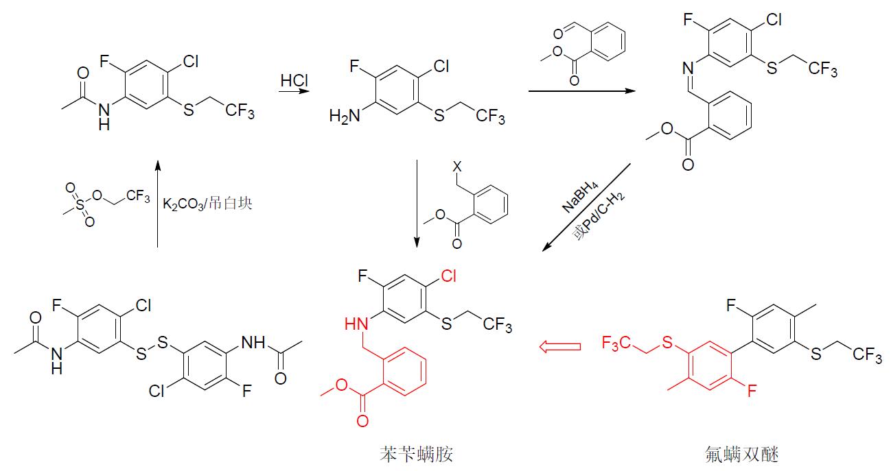 苯芐螨胺是繼氟螨雙醚(bisulflufen)后第2個(gè)獲ISO批準(zhǔn)的中國(guó)自主創(chuàng)制的三氟乙基硫醚類殺螨劑,具有獨(dú)特的化學(xué)機(jī)構(gòu),推測(cè)其作用機(jī)制與氟螨雙醚以及三氟乙基亞砜類殺螨劑sulfiflumin和flupentiofenox類同,為線粒體脂肪代謝和能量生成抑制劑。室內(nèi)生測(cè)結(jié)果表明,苯芐螨胺在6.25、3.12 mg/L時(shí)對(duì)朱砂葉螨的致死率均>90%(72 h),且在低質(zhì)量濃度時(shí)的活性優(yōu)于丁氟螨酯和聯(lián)苯肼酯。據(jù)開發(fā)公司報(bào)道,苯芐螨胺具有胃毒和觸殺活性,以及一定的葉片滲透性,對(duì)不同生長(zhǎng)發(fā)育階段的植食性螨均有效,速效性好且持效性長(zhǎng)達(dá)25 d以上。苯芐螨胺可能創(chuàng)制思路與合成路線見圖1。