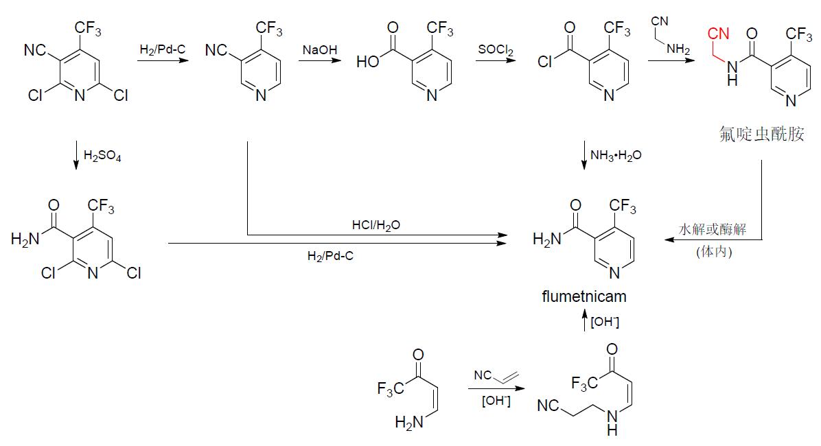 Flumetnicam(文獻(xiàn)代碼TFNA-AM)是由日本石原產(chǎn)業(yè)株式會(huì)社(ISK)最先研發(fā)報(bào)道的殺蟲劑,后被證實(shí)也是氟啶蟲酰胺在靶標(biāo)害蟲體內(nèi)的活化代謝物。據(jù)報(bào)道,flumetnicam具有優(yōu)異的根內(nèi)吸活性,其作用機(jī)制與氟啶蟲酰胺相同,為煙酰胺酶抑制劑,即通過煙酰胺的累積間接激活弦音器瞬時(shí)受體電位香草酸亞型(TRPV)通道發(fā)揮殺蟲活性,與吡蚜酮、吡啶喹唑啉、雙丙環(huán)蟲酯和嗪蟲唑酰胺無交互抗性或很低交互抗性風(fēng)險(xiǎn)。室內(nèi)生測(cè)結(jié)果表明,flumetnicam在800 mg/L時(shí)對(duì)桃蚜若蟲(5 d)和棕櫚薊馬成蟲(8 d)的殺死率均為100%。在中國(guó)的進(jìn)一步研究結(jié)果表明,flumetnicam對(duì)桃蚜若蟲、水稻褐飛虱若蟲和白粉虱1~2齡若蟲的半致死濃度(LC50,mg/L)分別為2.62(3 d)、1.51(10~15 d)和1.71(3 d),且與吡蚜酮或螺蟲乙酯混用具有顯著的協(xié)同增效作用。由于比氟啶蟲酰胺具有更快的擊倒作用,先正達(dá)公司將flumetnicam作為衛(wèi)生殺蟲劑進(jìn)行開發(fā),相關(guān)研究結(jié)果表明,該殺蟲劑可通過擊倒或食血抑制控制攜帶疾病的或食血性(攝食血液)的蚊、蠅、臭蟲和獵蝽等雙翅目、錐獵蝽亞科和臭蟲科等多類別衛(wèi)生害蟲。然而,埃及伊蚊等昆蟲表皮穿透性降低會(huì)降低其對(duì)flumetnicam的敏感性;對(duì)于岡比亞按蚊,flumetnicam與氟啶蟲酰胺存在交互抗性,但兩者與氯菊酯都無交互抗性。在美國(guó)和歐盟等國(guó)家和地區(qū),flumetnicam被作為氟啶蟲酰胺在食品中的殘留定義物。Flumetnicam熔點(diǎn)162.7℃,可制成50%WP和WG,可能創(chuàng)制思路和不同合成路線見圖3,合成可共用氟啶蟲酰胺的中間體,推測(cè)其生產(chǎn)成本比氟啶蟲酰胺低。