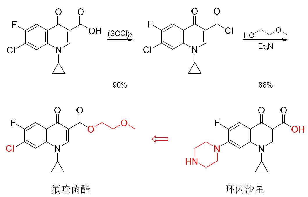 氟喹菌酯(開發(fā)代號(hào)LH-363)是山東省聯(lián)合農(nóng)藥工業(yè)有限公司開發(fā)的又一新型殺菌劑。從化學(xué)結(jié)構(gòu)上看,氟喹菌酯與環(huán)丙沙星(ciprofloxacin)和噁喹酸(oxilinic acid)等喹諾酮類抗菌藥物具有較高的相似性,可視為由環(huán)丙沙星進(jìn)行苯環(huán)上的取代基替換和羧基酯化保護(hù)得到。推測(cè)其作用機(jī)制與喹諾酮類抗菌藥物類同,為靶向細(xì)菌的DNA促旋酶(DNA gyrase)和拓?fù)洚悩?gòu)酶Ⅳ(topoisomerase Ⅳ)抑制劑。室內(nèi)生測(cè)結(jié)果表明,氟喹菌酯對(duì)黃瓜細(xì)菌性角斑病、煙草青枯病、馬鈴薯黑脛病、甘薯莖腐病、水稻白葉枯病、西瓜果斑病、大白菜黑腐病和軟腐病、木薯細(xì)菌性枯萎病、梨火疫病等細(xì)菌性病害的離體抑菌活性(1 mg/L)和活體保護(hù)效果(5 mg/L)均>90%,都顯著優(yōu)于喹啉銅和中生菌素;在200 mg/L時(shí)對(duì)作物安全且可促進(jìn)作物生長(zhǎng)發(fā)育(生長(zhǎng)速率、葉綠素和葉面積都增加)。氟喹菌酯可能創(chuàng)制思路和合成路線見圖10,其合成可以環(huán)丙沙星的關(guān)鍵中間體為起始原料。