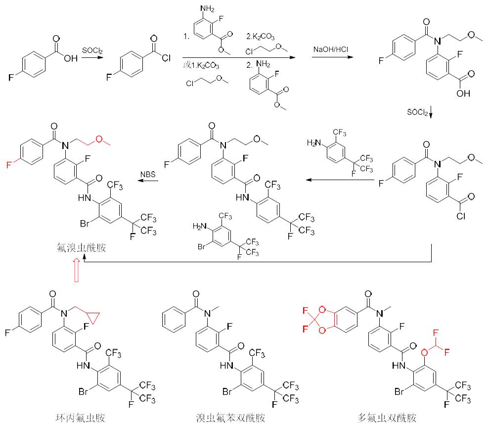 浙江宇龍藥業(yè)有限公司開發(fā)的氟溴蟲酰胺(開發(fā)代號(hào)SYN2971)是繼環(huán)丙氟蟲胺(cyproflanilide)和多氟蟲雙酰胺(piperflanilide)后,中國(guó)自主創(chuàng)制的第3款通用名獲ISO批準(zhǔn)的間苯二甲酰胺類殺蟲劑,熔點(diǎn)152.4~153.2℃。該殺蟲劑可視為用甲氧乙基對(duì)環(huán)丙氟蟲胺(cyproflanilide)的環(huán)丙烷甲基進(jìn)行修飾得到,推測(cè)其作用機(jī)制與溴蟲氟苯雙酰胺(broflanilide)、環(huán)丙氟蟲胺和多氟蟲雙酰胺相同,為γ-氨基丁酸門控氯離子通道變構(gòu)調(diào)節(jié)劑。室內(nèi)生測(cè)結(jié)果(表2)表明,氟溴蟲酰胺對(duì)鱗翅目害蟲小菜蛾、二化螟和草地貪夜蛾的敏感和抗性種群幼蟲具有高殺蟲活性,無論是速效性還是低濃度的害蟲殺死率都優(yōu)于溴蟲氟苯雙酰胺。氟溴蟲酰胺可能創(chuàng)制思路與合成路線見圖5,以2-氟-3-氨基苯甲酸甲酯計(jì),先酰胺化路線和后酰胺化路線總收率分別為90.3%、78.6%,合成可共用溴蟲氟苯雙酰胺、環(huán)丙氟蟲胺和多氟蟲雙酰胺的中間體,使用乙醇、異丙醚或乙二醇單甲醚重結(jié)晶所得晶體晶型一致且穩(wěn)定性好。