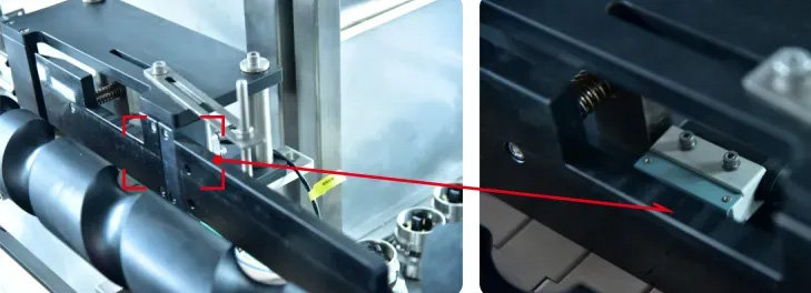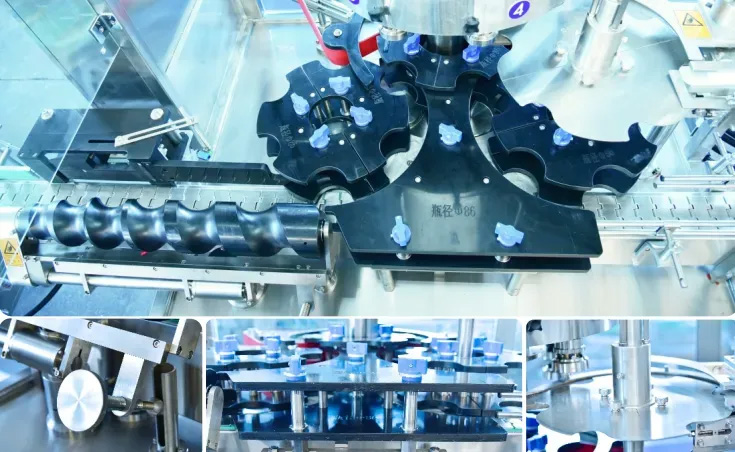 ①旋蓋機(jī)配備倒瓶、卡瓶檢測(cè)開(kāi)關(guān),當(dāng)出現(xiàn)倒瓶或者卡瓶時(shí)設(shè)備自動(dòng)停機(jī),以免損壞麻花或者星輪。