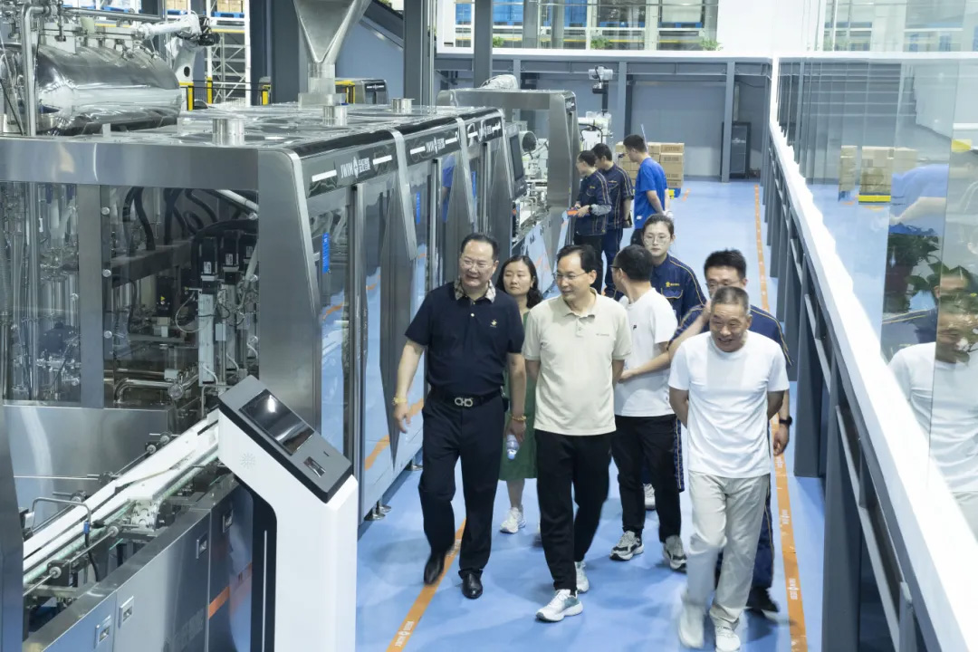參觀中,其自主研發(fā)的瓶裝集成智能生產(chǎn)線高效運(yùn)轉(zhuǎn),產(chǎn)能達(dá)每小時(shí)7200瓶(人工6倍),集成一鍵清洗、視覺(jué)檢測(cè)、在線稱(chēng)重、柔性生產(chǎn)等多項(xiàng)功能,實(shí)現(xiàn)顯著提質(zhì)降本增效。