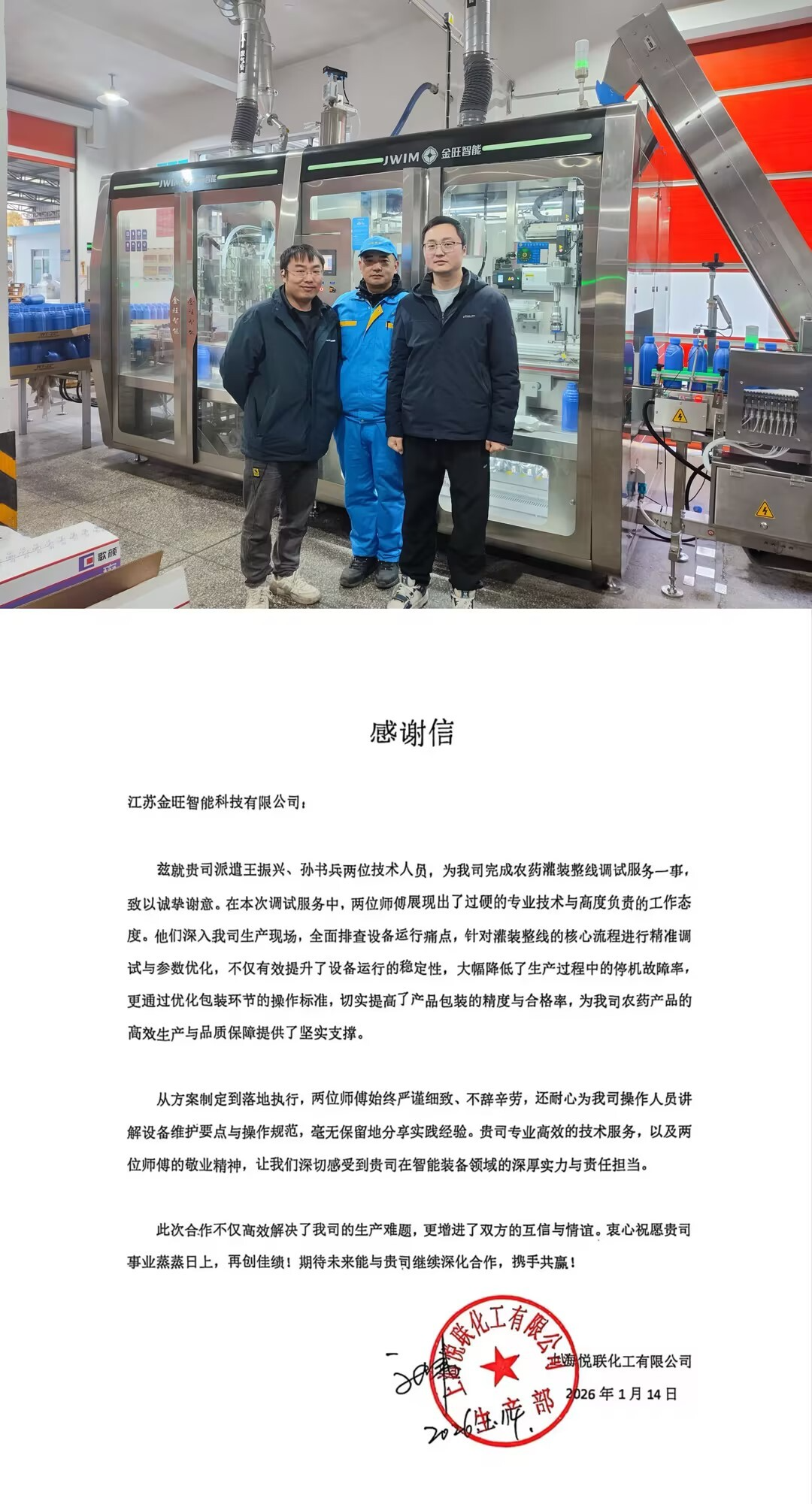 近日,上海悅聯(lián)化工有限公司向我司發(fā)來一封熱情洋溢的感謝信,對金旺技術(shù)團(tuán)隊(duì)的王振興、孫書兵兩位同事在項(xiàng)目中的卓越表現(xiàn),表示高度認(rèn)可與誠摯感謝。