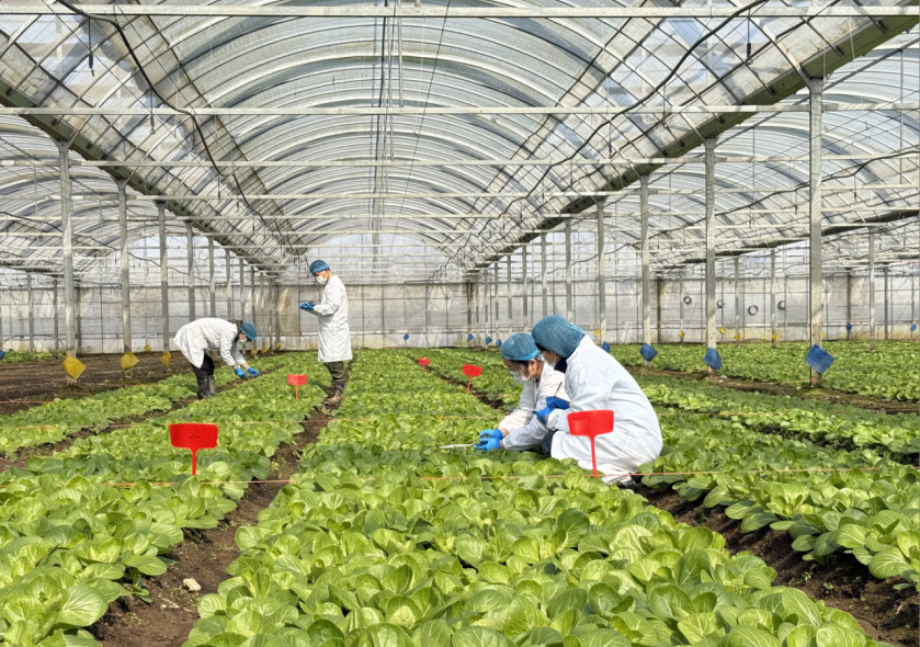 硅羿科技團隊成員在浦東新區(qū)試驗田現(xiàn)場測試十字花科蔬菜殺蟲劑的效能