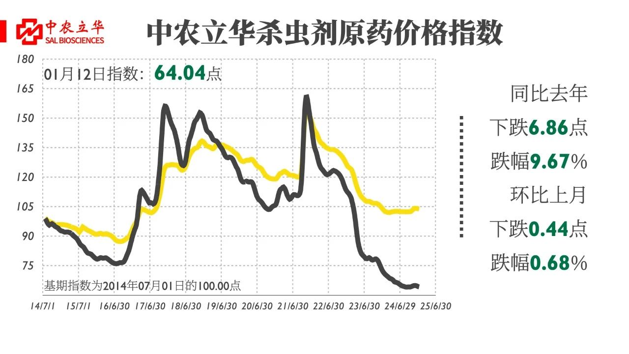 2025年1月12日,中農立華殺蟲劑原藥價格指數(shù)報64.04點,同比去年下跌9.67%,環(huán)比上月下跌0.68%。