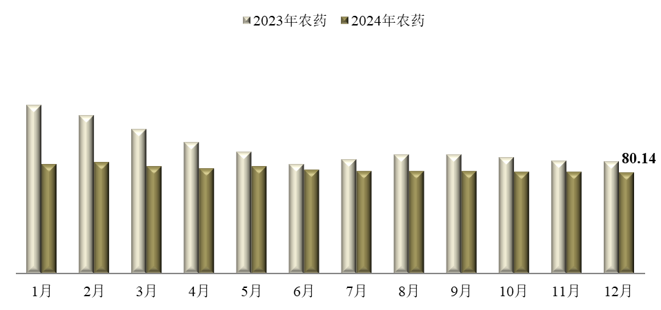 2024年12月,中國農(nóng)藥價格指數(shù)小幅回落。據(jù)中國農(nóng)藥工業(yè)協(xié)會統(tǒng)計,12月農(nóng)藥價格指數(shù)(CAPI)為80.14,環(huán)比下跌0.99%,同比下跌10.44%。整體來看,農(nóng)藥產(chǎn)品市場價格波動運行,大部分產(chǎn)品價格仍保持在低位甚至成本線運行,短期內(nèi)缺乏強(qiáng)勁、有效的提價因素,但部分產(chǎn)品因市場需求增加、供貨緊張等因素影響,價格回升趨勢明顯。本月,草甘膦、異丙甲草胺、毒死蜱、多菌靈等多個大宗產(chǎn)品成交價格回落,帶動價格指數(shù)整體下跌。