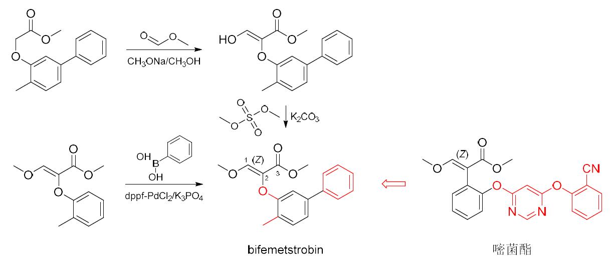 Bifemetstrobin(開發(fā)代號(hào)S-2326)是日本住友化學(xué)株式會(huì)社開發(fā)的新型殺菌劑,其化學(xué)結(jié)構(gòu)與嘧菌酯相似,可視為由4-甲基聯(lián)苯氧基對(duì)2-位的芳環(huán)進(jìn)行修飾得到。與其他甲氧基丙烯酸類殺菌劑不同,bifemetstrobin在甲氧基丙烯酸酯和苯環(huán)之間插入了氧原子。推測(cè)bifemetstrobin的作用機(jī)制與甲氧基丙烯酸酯類殺菌劑類同,均為呼吸鏈線粒體復(fù)合物Ⅲ細(xì)胞色素bc1(泛醇氧化酶)外側(cè)Qo位點(diǎn)(cyt b基因)抑制劑。室內(nèi)生測(cè)結(jié)果表明,bifemetstrobin在500 mg/L時(shí)對(duì)水稻稻瘟病(6 d)、小麥白粉?。? d)、銹病(7 d)、疫?。?1 d)和紋枯?。?1 d),以及葡萄霜霉?。? d)、黃瓜白粉?。?2 d)的預(yù)防效果>90%。Bifemetstrobin與吡唑酰胺和吡啶酰胺類殺菌劑混用具有協(xié)同增效作用。進(jìn)一步的研究結(jié)果表明,bifemetstrobin的復(fù)配對(duì)小麥殼針孢葉枯病菌(Septoria tritici,敏感系及抗性系)、黃瓜白粉?。?/span>Sphaerotheca fuliginea)、炭疽?。?/span>Colletotrichum lagenarium,敏感系及抗性系)和霜霉?。?/span>Pseudoperonospora cubensis,敏感系及抗性系)、番茄葉霉病(Cladosporium fulvum)、大豆銹?。?/span>Phakopsora pachyrhizi,敏感系及抗性系)、灰斑?。?/span>Cercospora sojina,敏感系及抗性系)和霜霉病(Erysiphe diffusa)、小麥葉銹病(Puccinia recondita)、水稻稻瘟?。?/span>Magnaporthe grisea,敏感系及抗性系)、大麥網(wǎng)斑?。?/span>Pyrenophora teres,敏感系及抗性系)、豆角菌核?。?/span>Sclerotinia sclerotiorum)和大麥云紋病菌(Rhynchosporium secalis,敏感系及抗性系)、玉米灰斑病菌(Cercospora zeae-maydis)和馬鈴薯早疫?。?/span>Alternaria solani)等多種病害均具有較高活性。Bifemetstrobin為(Z)-式異構(gòu)體,可能創(chuàng)制思路和合成路線見圖7,粗品可用二甲苯、二甲苯/甲醇混合液、乙酸乙酯/正己烷混合液重結(jié)晶或硅膠柱層析精制提純。