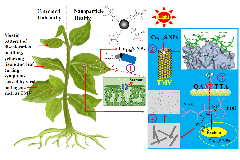 納米材料由于具有優(yōu)異的物理和化學(xué)性質(zhì),其作為防治植物病害的新型納米農(nóng)用化學(xué)品而受到人們的特別關(guān)注。最近研究基于煙草花葉病毒結(jié)構(gòu)特征,制備了尺度為3nm的硫化銅手性納米顆粒。我們提出了一種假設(shè)的噴灑硫化銅手性納米顆粒殺死植物病毒的工作模型(圖1)。首先在陽(yáng)光照射下,向植物噴灑硫化銅手性納米顆粒,NPs通過(guò)氣孔進(jìn)入植物細(xì)胞。然后NPs可以很容易地進(jìn)入TMV CP的孔隙,識(shí)別CP中的七肽QANPTTA,并在Asn101 (N101)和Pro102 (P102)之間裂解。最后,TMV的桿狀體被破壞,轉(zhuǎn)化為不規(guī)則的聚集體,從而有效地殺死植物病毒。